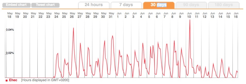 Das Beispiel EHEC – als eher europäisches Thema – zeigt den Krisenverlauf in der Twitter-Ära deutlich. Am 24 Mai schoss der Anteil der EHEC-Tweets an allen gesendeten Kurznachrichten auf 0.02% hoch und gipfelte am 10. Juni bei rund 0.05%. Danach hat das Thema kaum noch Relevanz. (siehe Grafik rechts)
