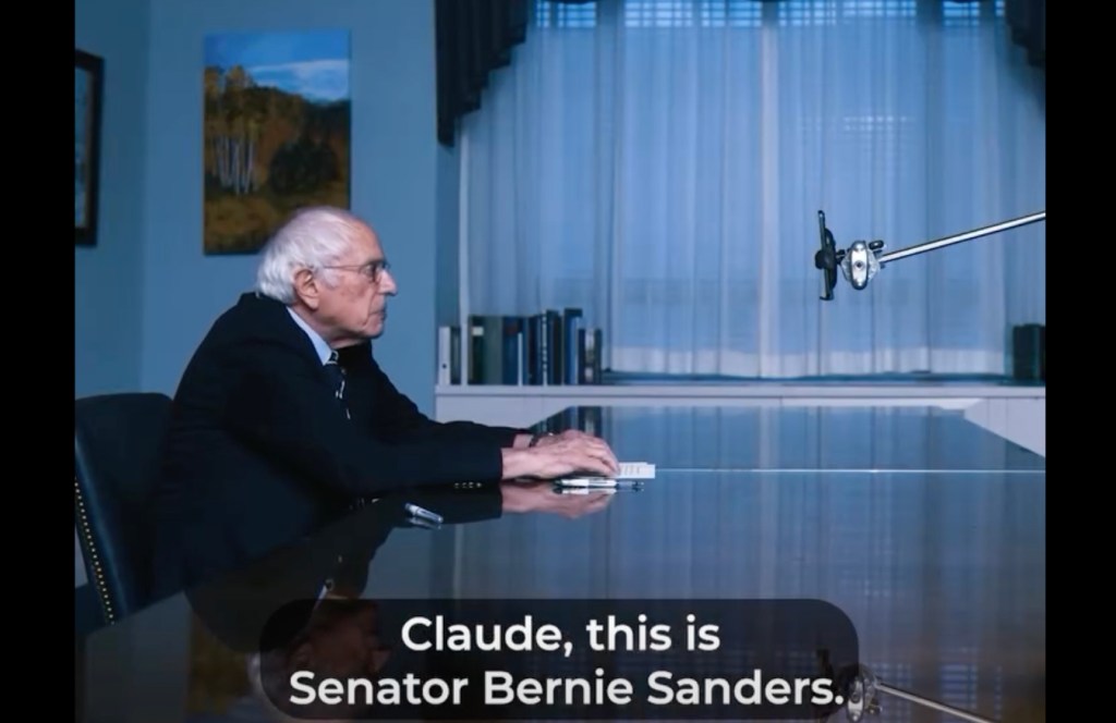 Sanders sitzt an einem Tisch, ein Smartphone vor sich. Er stellt Fragen. Claude antwortet. Die Inszenierung ist bewusst schlicht gewählt. Der Senator sitzt mit Zetteln statt mit Teleprompter vor dem Telefon, es wird keine Grafik oder sonstwas eingeblendet. Eine ganz schlichte Gesprächssituation, die an eine Senatsanhörung erinnert. Sie ist bewusst langsam, deliberativ, gehalten, als ob gleich jemand einen Schwur abnehmen würde.